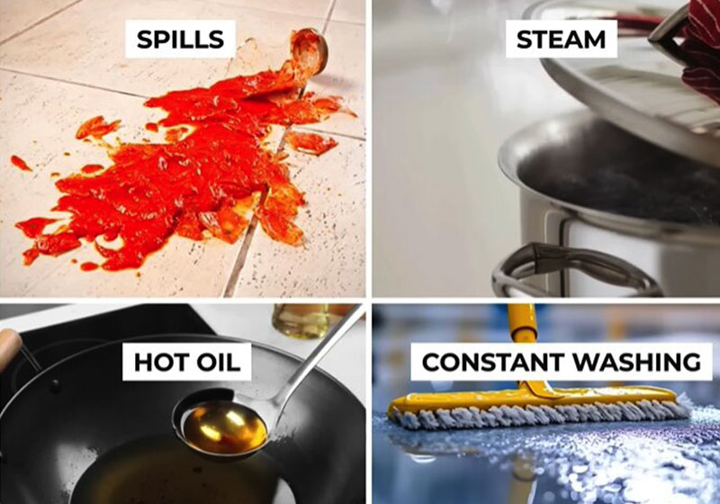 The operational challenges in industrial kitchens: spills, steam, hot oil, and constant washing